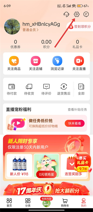 1、打开惠买软件,进入【我的】页面,点击设置区吧。