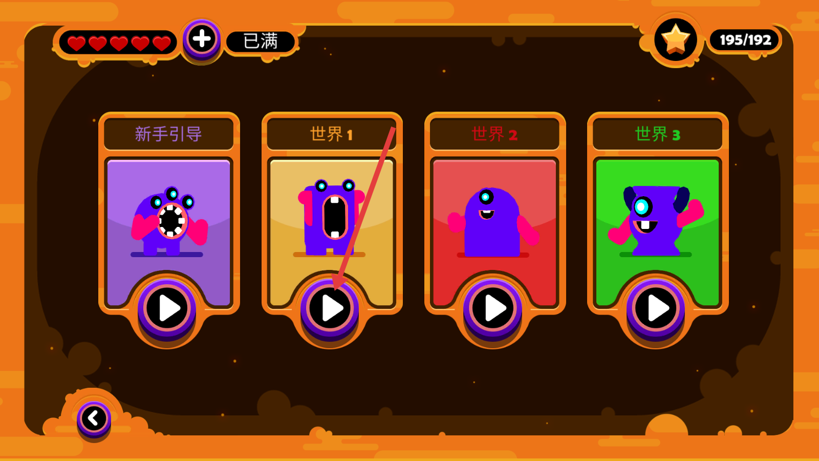 2、点击【世界1】播放按钮,进入第一世界的游戏关卡。