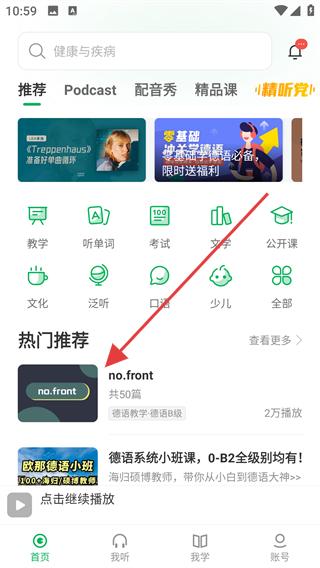 1、在首页热门推荐中选择内容(如【no.front】),进入该内容的音频列表页,查看相关音频资源。