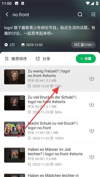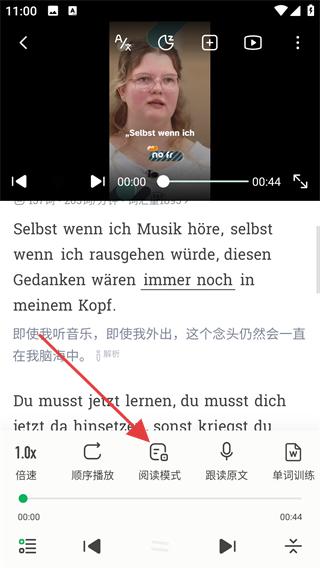 2、选择列表中的音频进入播放页,可使用【跟读原文】功能同步查看德语原文及中文翻译。