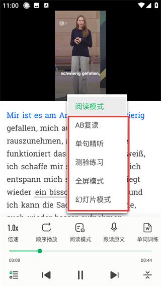 4、选择【AB复读】【单句精听】等学习模式。根据学习需求选择对应模式(如【测验练习】)。