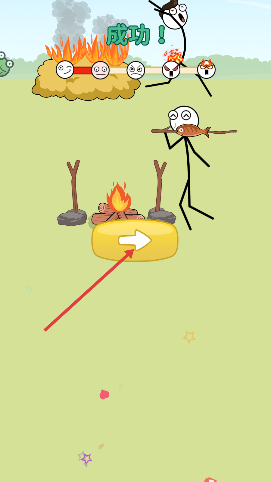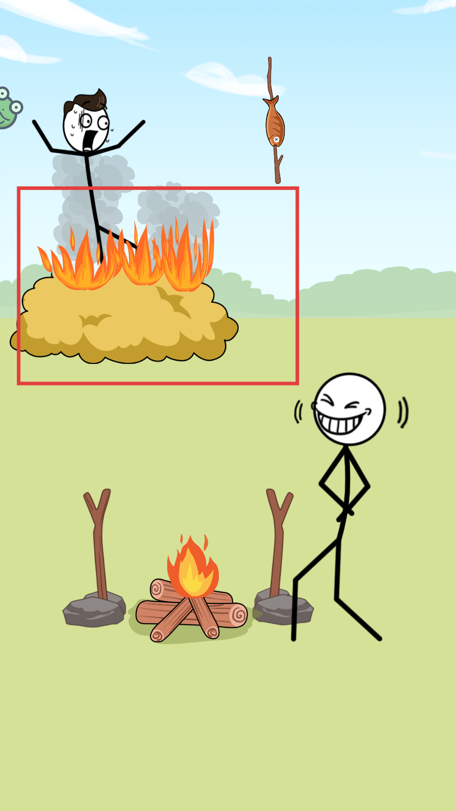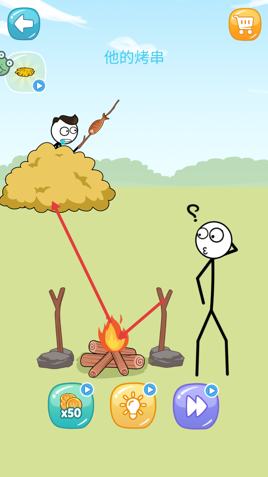 2、在【他的烤串】关卡中,将火堆的火引向草堆。