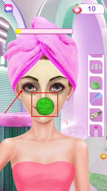 4、最后选绿色鼻贴等道具,护理面部特定区域,推进美妆步骤。