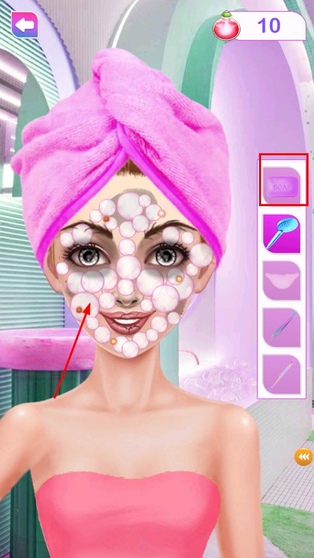 2、选右侧【SOAP】道具,涂抹面部,打出泡沫,进行清洁步骤。