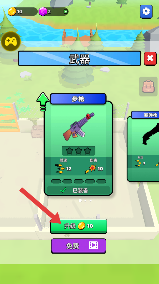 4、进入升级武器界面,点击【升级】花费10金币将武器升级。