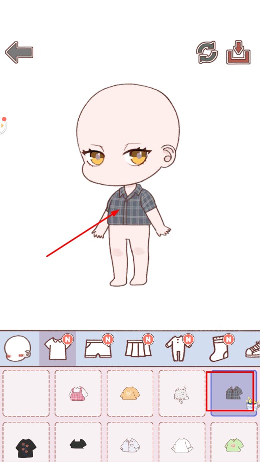3、在服饰栏选格子衬衫,为角色穿上,初步塑造上衣造型。