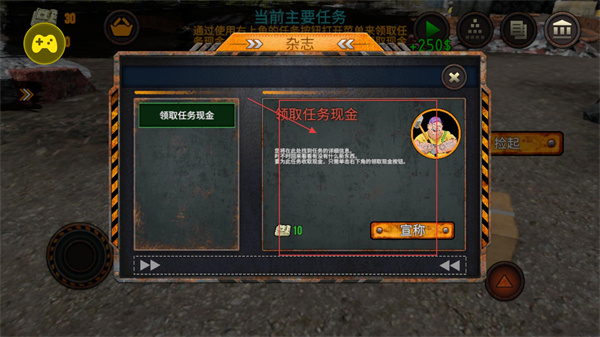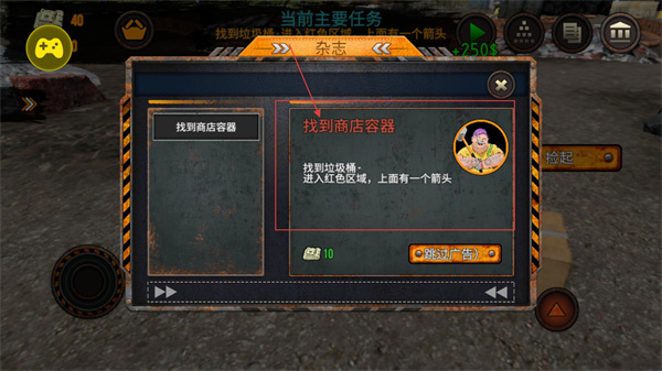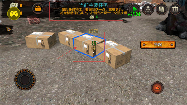 1、靠近【纸箱】类物品,待右侧出现【捡起】按钮后点击,可获取对应物品并积累资源,这是完成基础任务的核心交互方式。