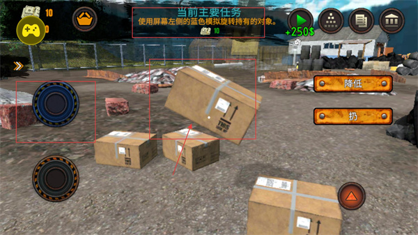 2、拾取物品后,通过左侧蓝色模拟轮盘旋转持有对象,再利用【降低】【扔】按钮调整物品位置,完成物品操作类任务要求。