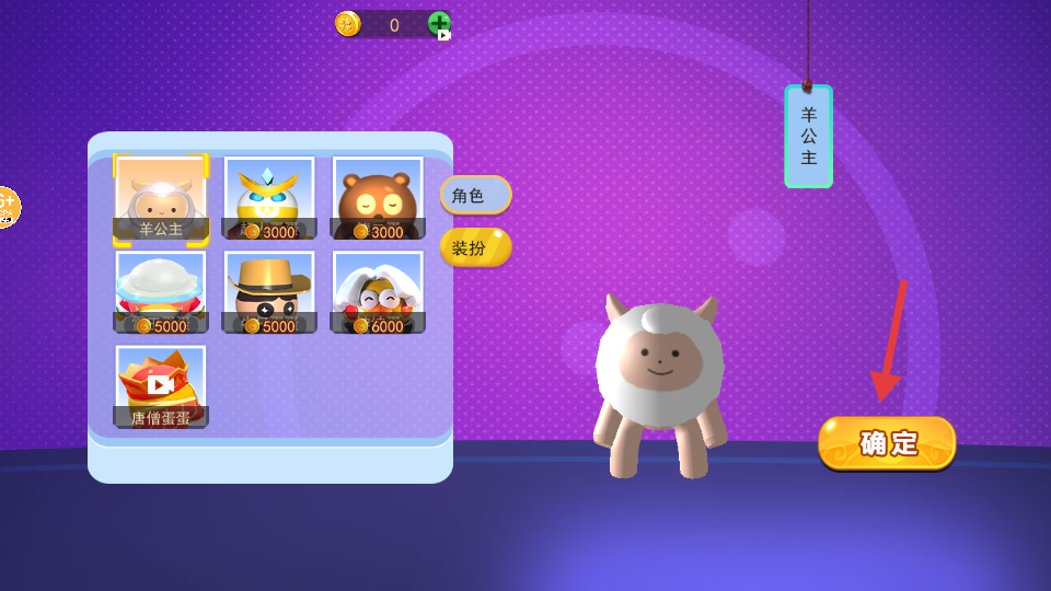 2、进入角色选择界面,挑选【羊公主】等角色,点击【确定】。