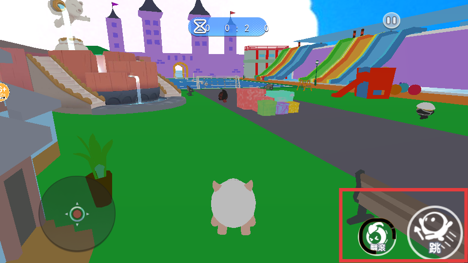 3、在游戏场景中,用左侧摇杆控制角色移动,点击【翻滚】【跳】按钮做对应动作。