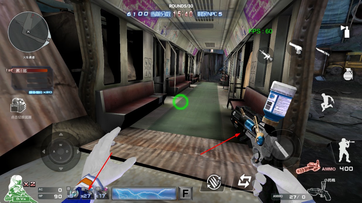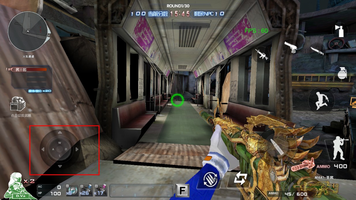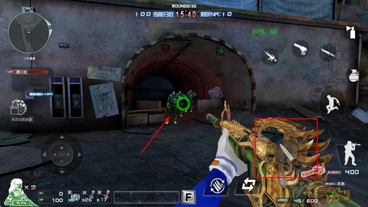 1、进入游戏,操控角色在“火车通道”场景移动,利用右侧开枪,瞄准敌人。