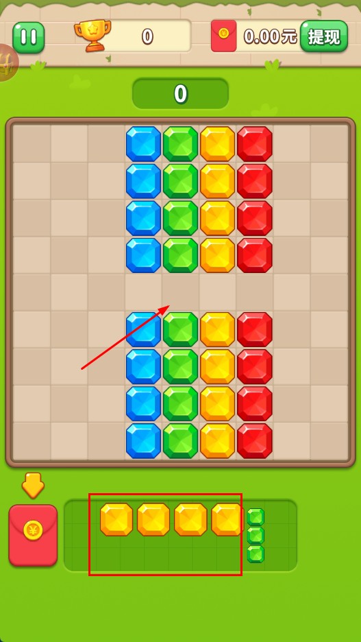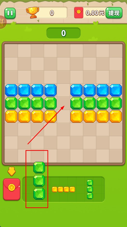 2、拖动绿色竖条宝石,放入上方对应绿色宝石列旁,填充布局形成三消。