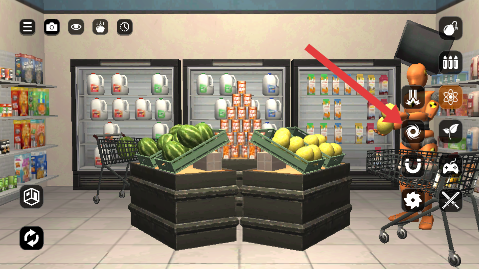 3、瞄准超市内的水果、货架等物品,【点击】任意位置扔出小黑洞进行破坏。