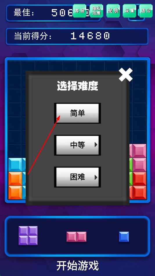 2、在难度选择界面,点击【简单】,选择简单难度,开始游戏。