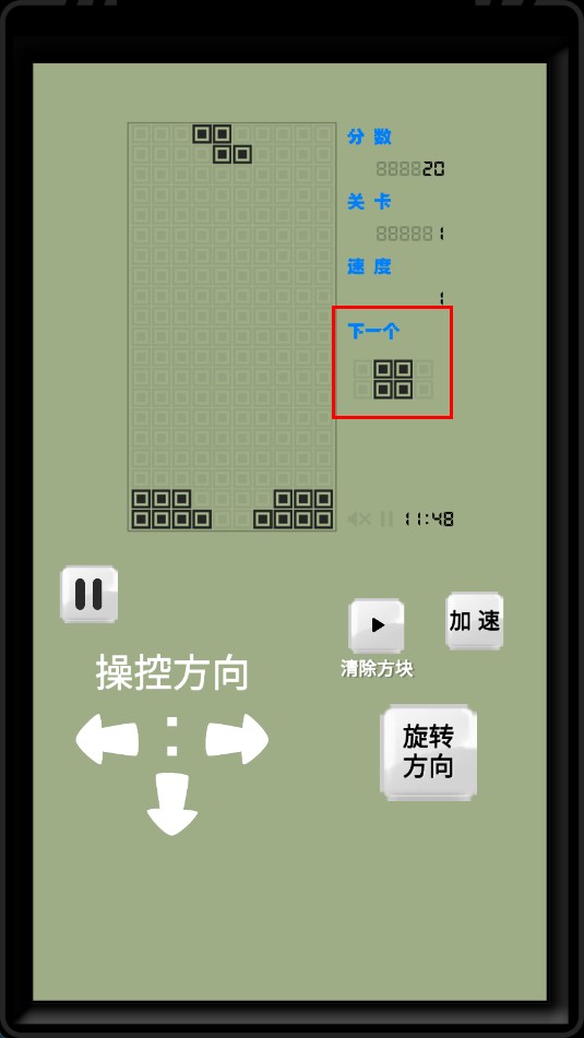 4、留意右侧“下一个”提示的方块形状,提前规划,合理放置方块,凑齐同色或填满行消除得分。