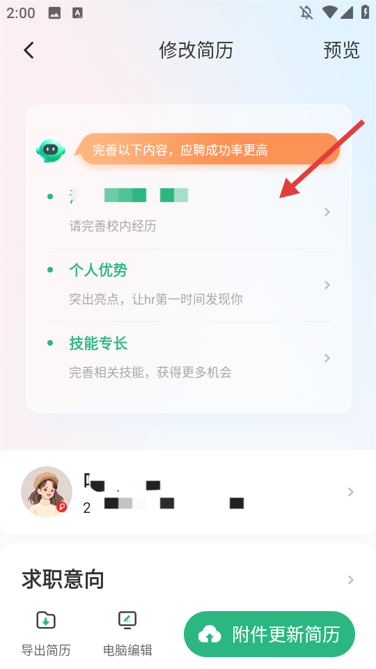 3、在【修改简历】页面,点击【请完善校内经历】。