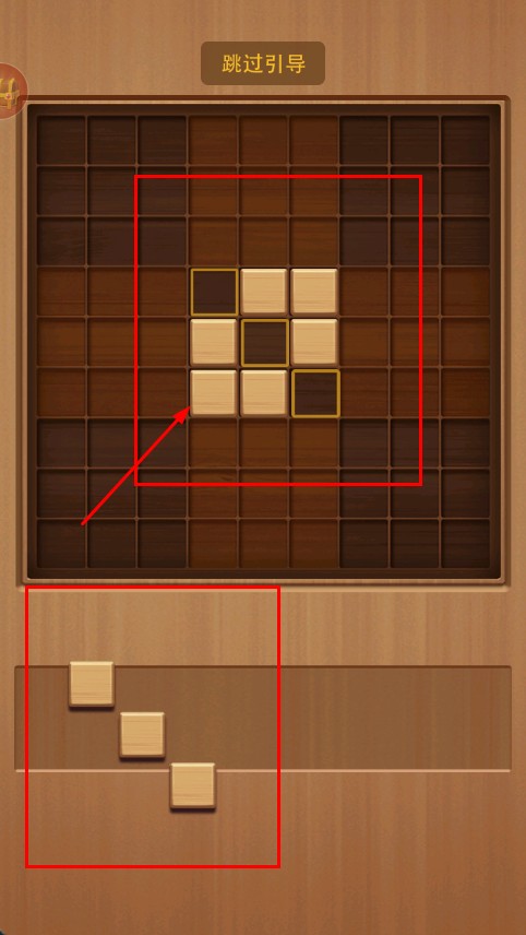 2、根据下方方块形状,拖拽至上方对应空格,完成九宫格区域的方块填充。