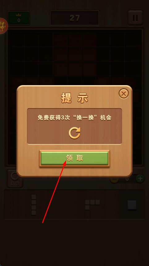 4、遇到方块形状不合适时,点击【领取】,获取“换一换”机会,更换下方方块。