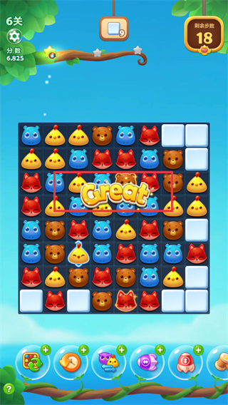 4、消除动物头像后会出现【Great】提示并增加分数注意剩余步数通过连续消除提高得分效率。
