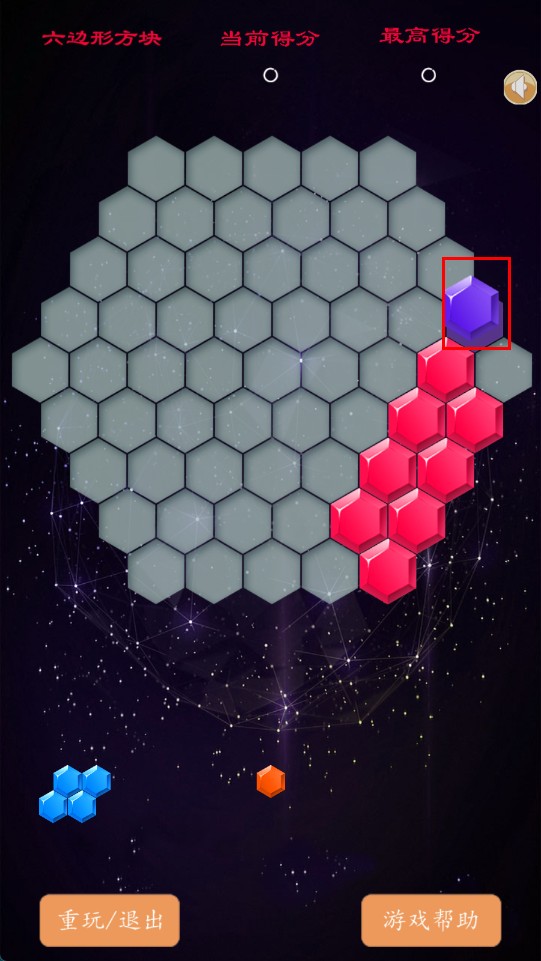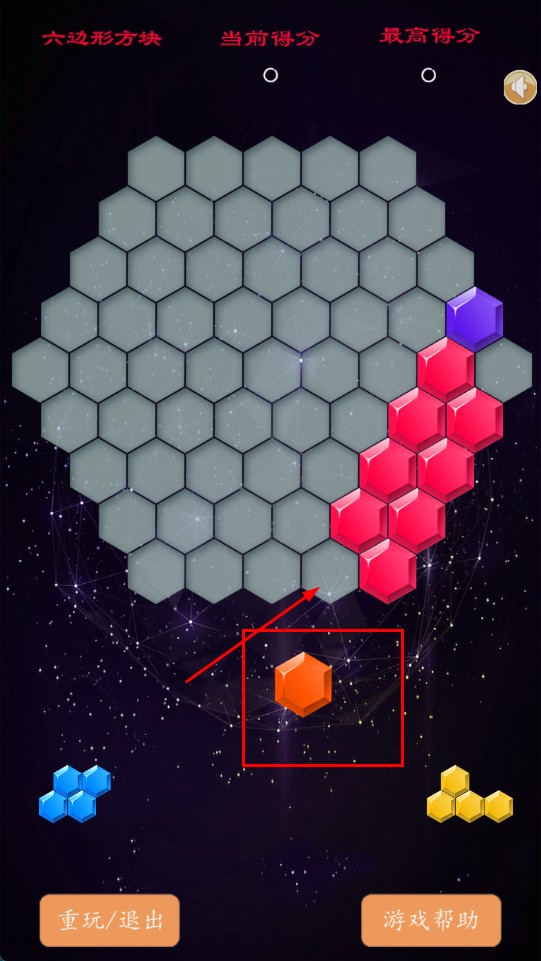 2、观察下方方块形状,拖拽至上方六边形网格的合适位置,进行拼接。