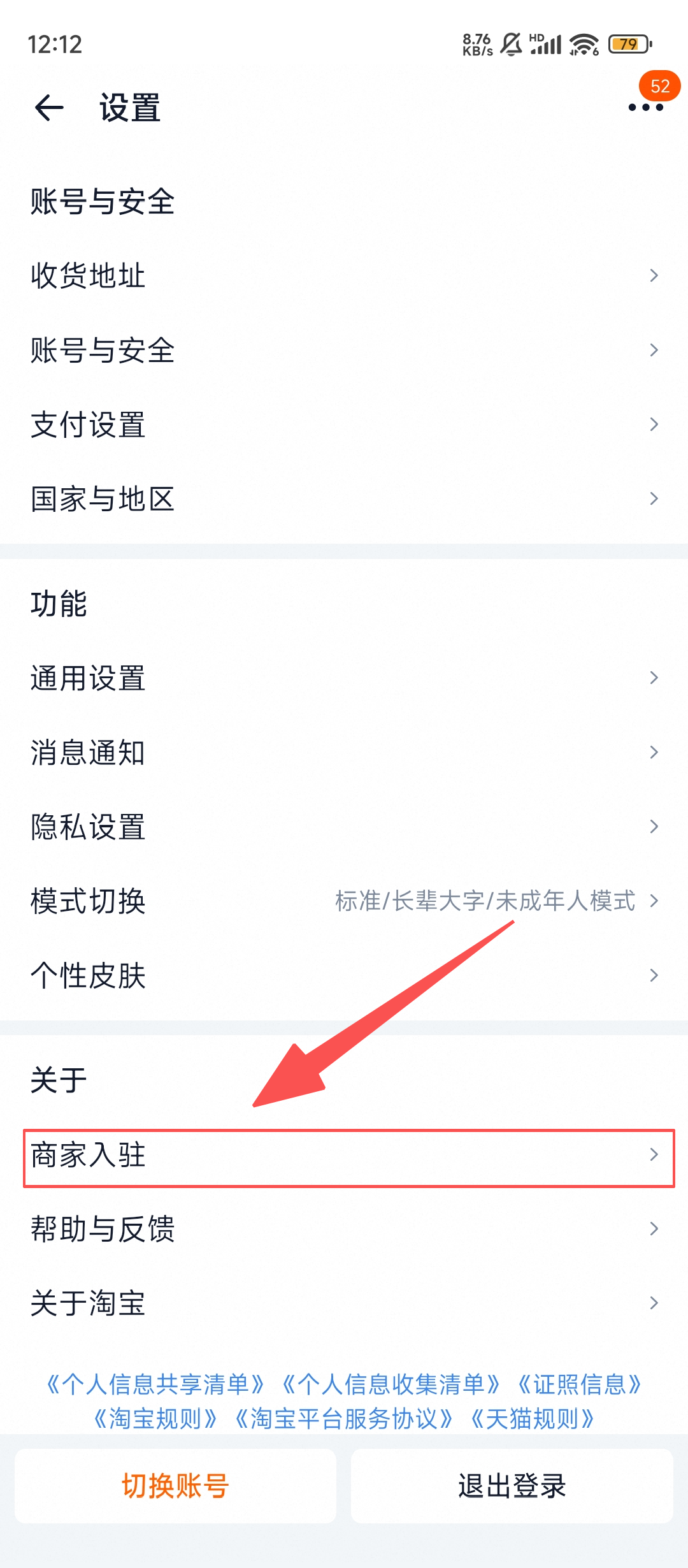 1、进入淘宝【设置】页面,找到并点击【商家入驻】选项,即可进入商家入驻相关页面。