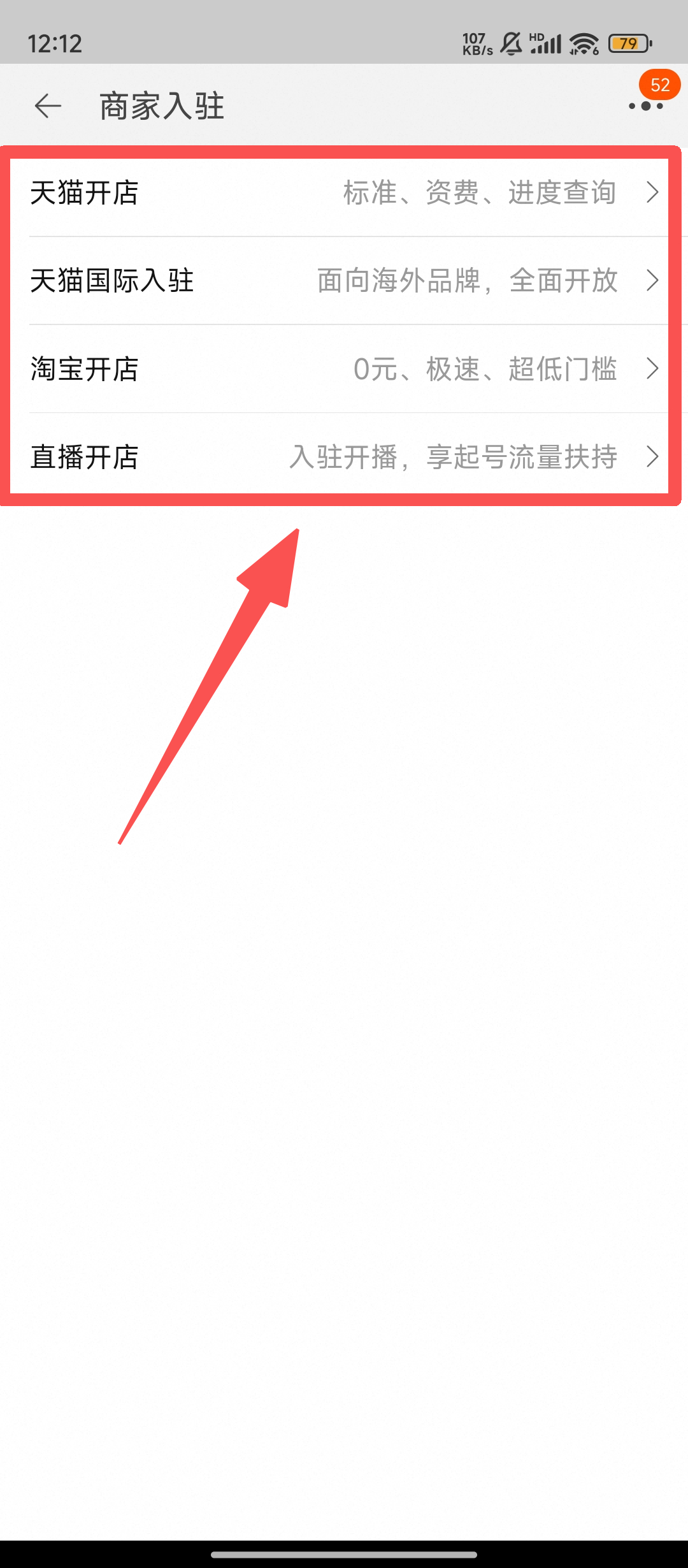 2、在【商家入驻】页面,选择任意一个开店选项,准备开张自己的店铺吧。