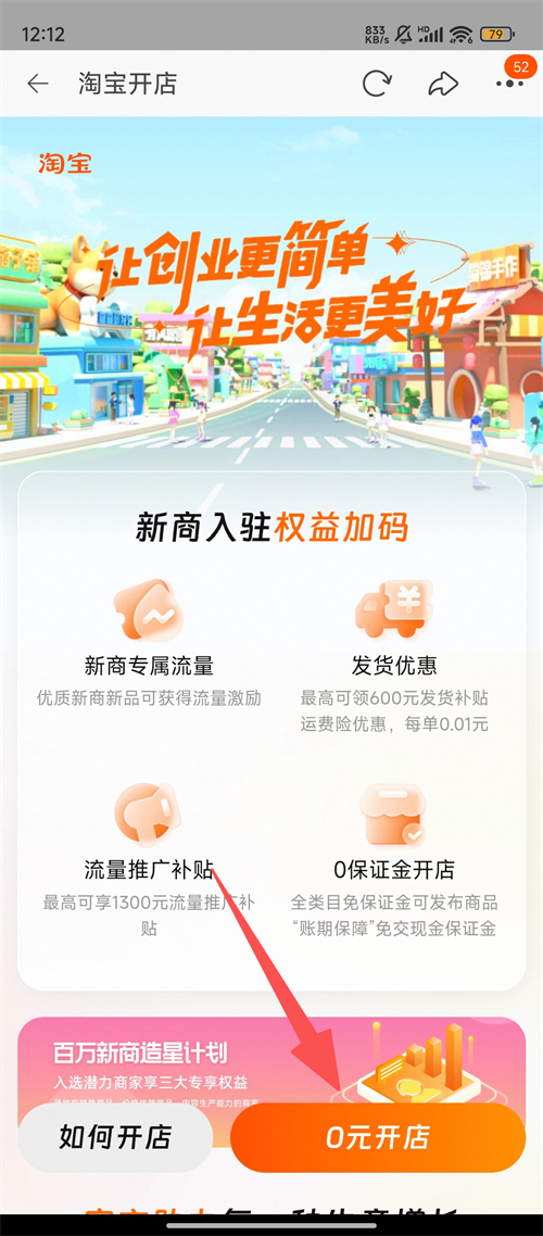 3、在【淘宝开店】页面,点击橙色的【0元开店】按钮,启动店铺开设流程。