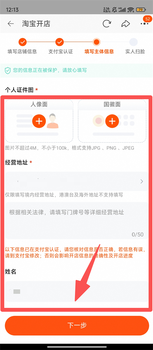 4、之后按要求上传【个人证件图】、填写【经营地址】等信息,确认信息无误后点击【下一步】,等待审核就好啦。