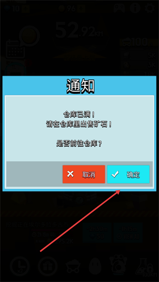 1、收到【仓库已满!请在仓库里出售矿石!是否前往仓库】的通知,点击【确定】前往仓库,及时处理矿石避免资源堆积。