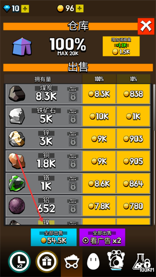 2、仓库中各类矿石拥有量充足(如【煤炭-8.3K】【铁矿石-5K】),可选择【全部出售】获取【54.5K】金币,快速积累资金。