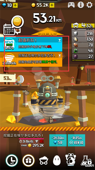 3、当前挖掘进度达【53.21Km】,留意【超值折扣!挖掘开外加快结束了哦】的提示,及时利用增益提升挖矿效率。