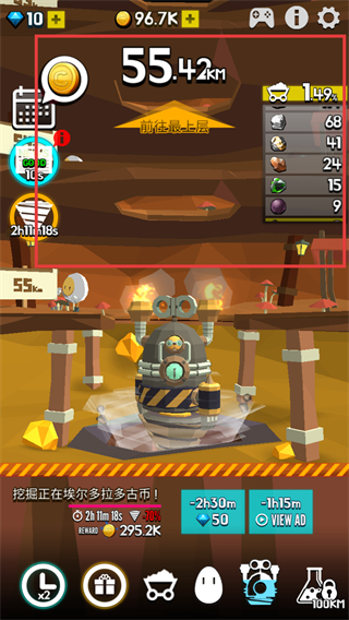 4、挖掘进度推进至【55.42Km】,关注上方资源统计(如【4.52】类资源数量),合理规划后续挖矿与资源处理节奏。
