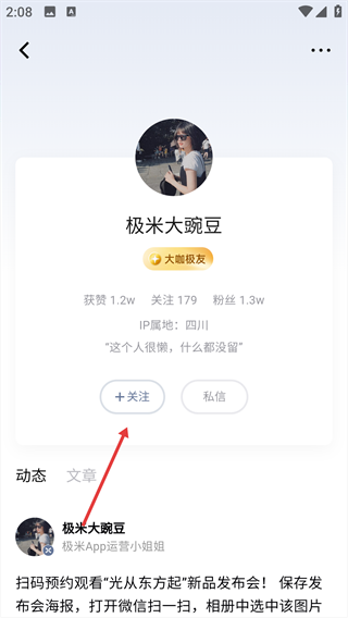 3、在内容详情页,点击用户的头像区域,进入该用户的个人主页。