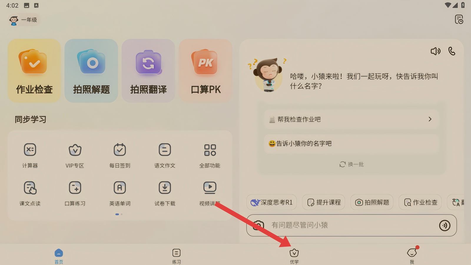 1、打开小猿搜题App,点击底部【优学】,进入优学板块,开启英语课文学习的第一步呀。