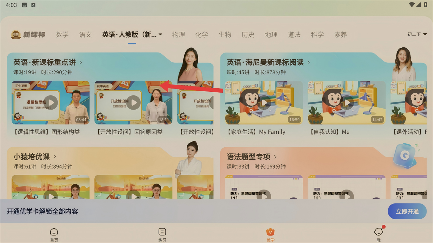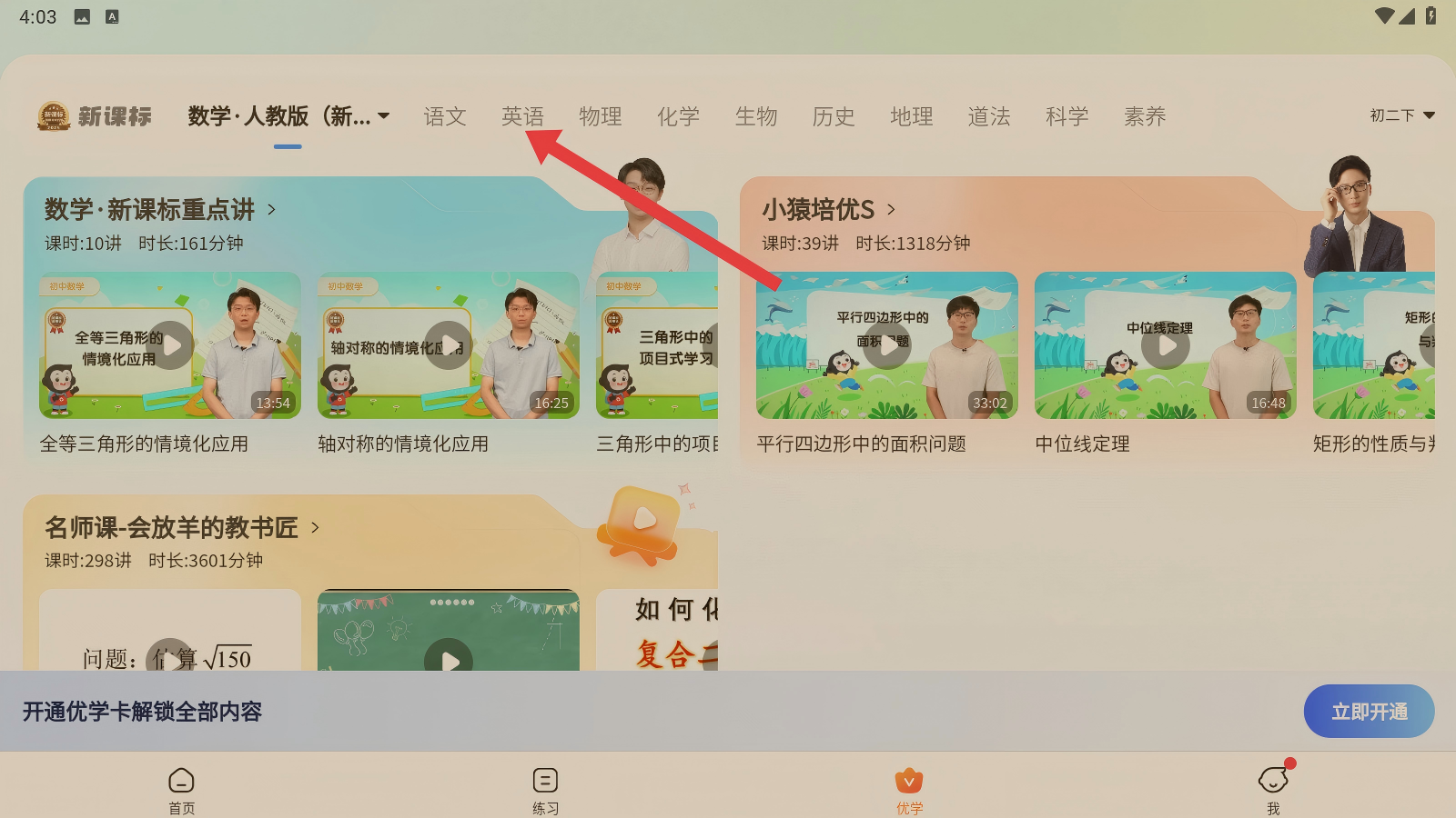 2、在优学板块,点击【英语】科目标签,切换到英语学科的学习内容,方便查找英语课文资源呢。