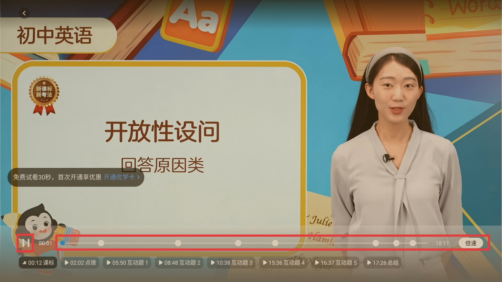 4、在英语课文视频播放页,可点击进度条或【倍速】调整播放速度,还能免费试看,助力英语课文学习哦。