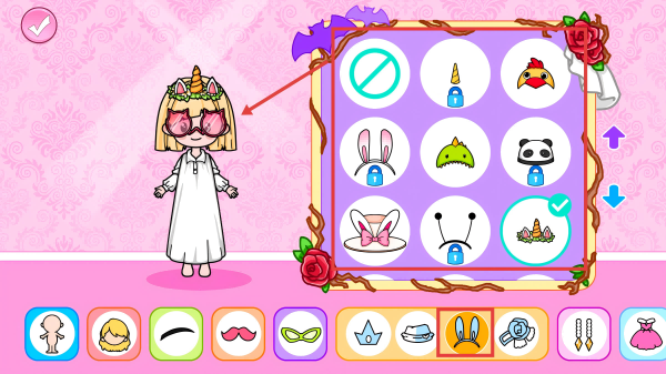3、进入头饰分类,选择独角兽头饰,为角色添加可爱的头部装饰,丰富造型。