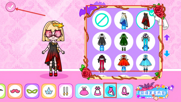 4、从服装栏选心仪的裙子,搭配好后点击左上角对勾,确认并保存角色的整体装扮。
