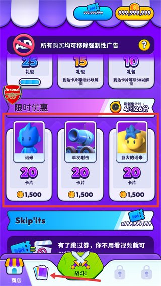 2、在商店里,花费金币购买英雄卡片(如诺米、单发射击、巨大的诺米)后,点击商店旁边的【军械库】进入升级界面。