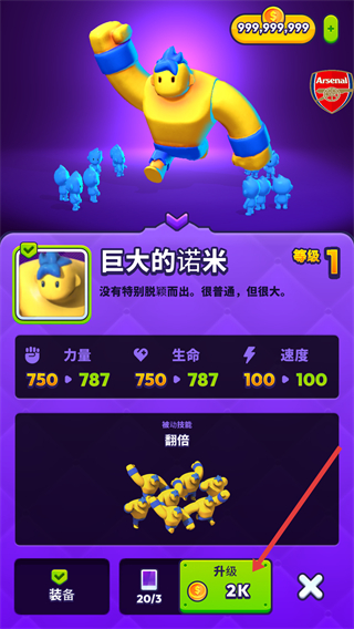 4、在英雄详情页,点击【升级】按钮花费金币(如2K)提升英雄等级,增强英雄的力量、生命、速度等属性,为战斗提供更强助力。
