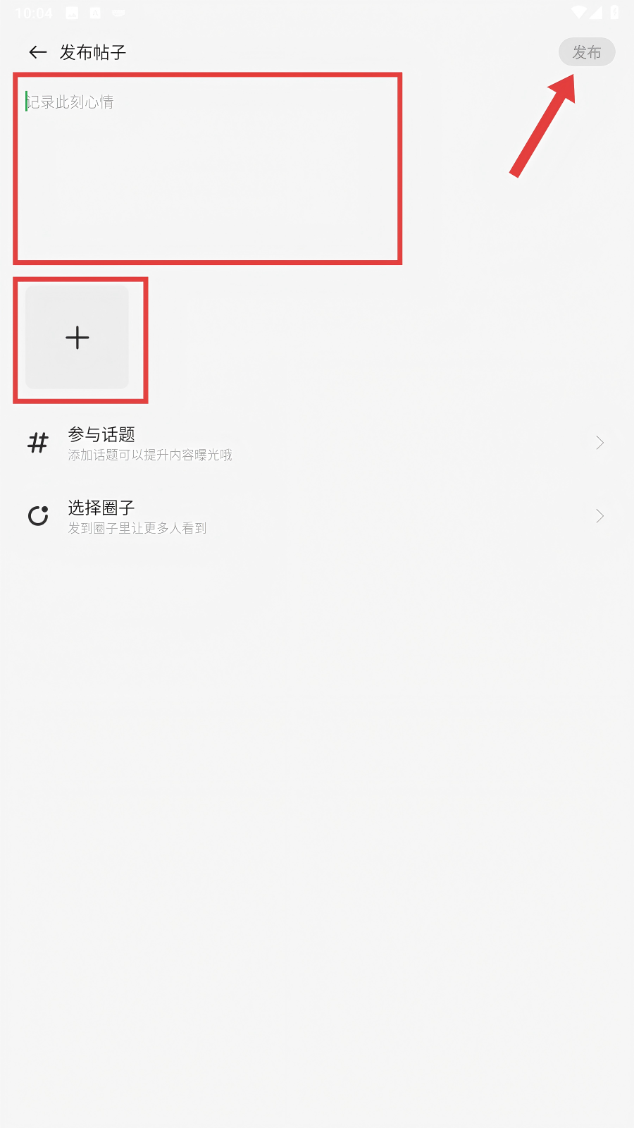 3、进入发布帖子页面后,我们在输入框里写下心情,还能点击下方的【+】添加图片,做好后点击右上角【发布】就行啦。