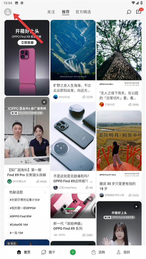 1、我们打开【OPPO社区】后,点击首页左上角的头像,就能进入个人页面,开始准备发帖的操作啦。