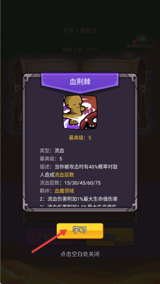 4、点击【学习】掌握血荆棘,获取其概率对敌人造成流血的战斗能力。