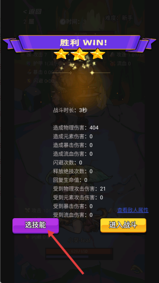 2、在胜利界面点击【选技能】,进入技能选择环节,配置对战能力。