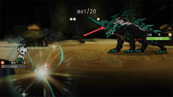 3、进入战斗界面,当前【回合1/20】,操控己方【旋龟-1级】,对抗敌方【狰-10级】,关注双方生命值状态进行操作。