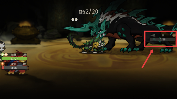 4、战斗推进至【回合2/20】,己方灵兽击败敌方【狰-10级】(生命值0/88),同时留意己方灵兽状态,继续推进回合。