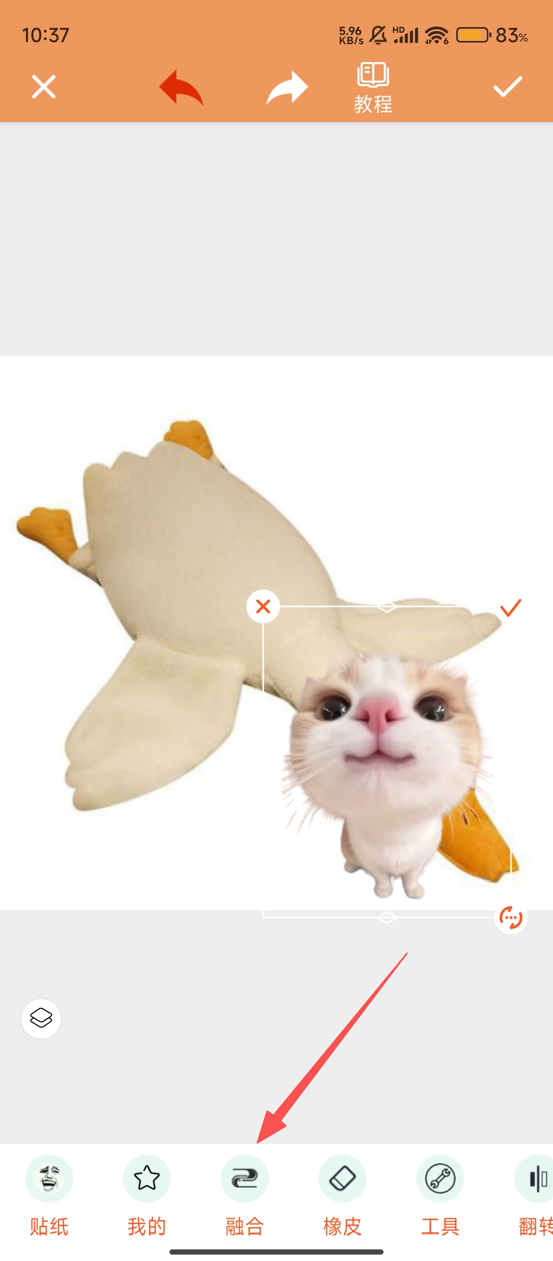 2、添加贴图后,点击底部【融合】功能,能对贴图进行融合处理,让贴图与原图结合更自然,提升创作效果呢。