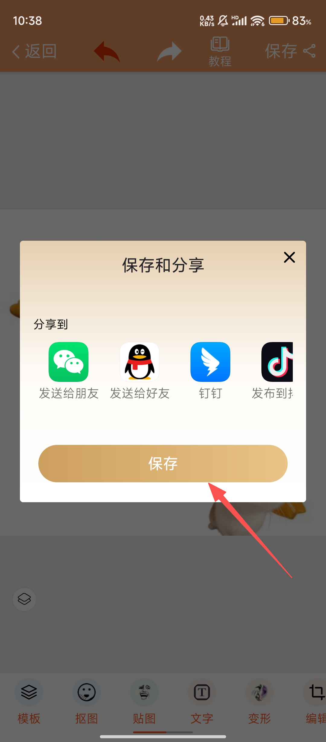 4、图片编辑完毕,点击保存,在弹出的【保存和分享】界面中点击保存,即可将融合后的搞怪图片留存,随时分享乐趣啦。