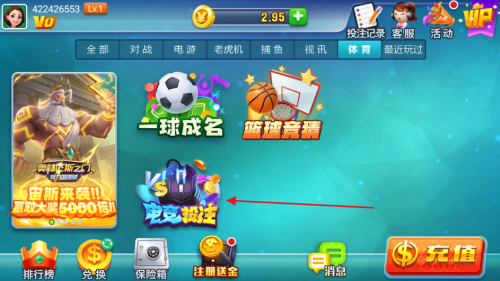 1、进入游戏后,找到顶部导航中的体育,点击切换;