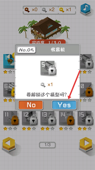 1、在关卡界面,选择【No.05-收音机】模型,点击【Yes】消耗道具解锁该组装关卡,推进游戏进度。